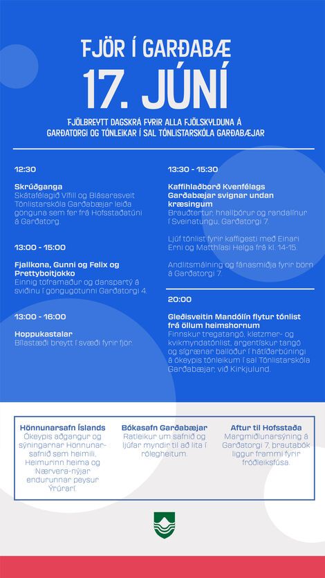 Dagskrá verður fyrir alla fjölskylduna á Garðatorgi á 17. júní og tónleikar í sal Tónlistarskólans. Skrúðganga, hoppukastalar, fjallkonan, Gunni og Felix, Kvenfélagskaffi og fleira fjör í boði á Garðatorgi.