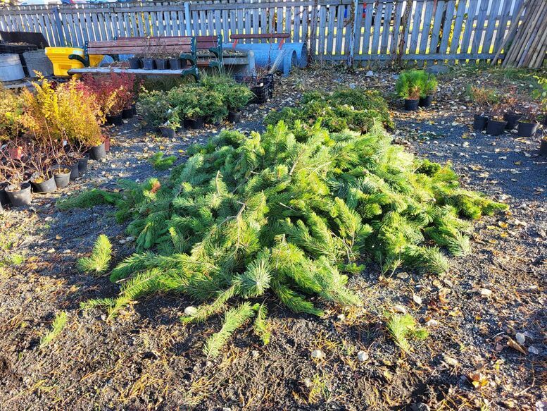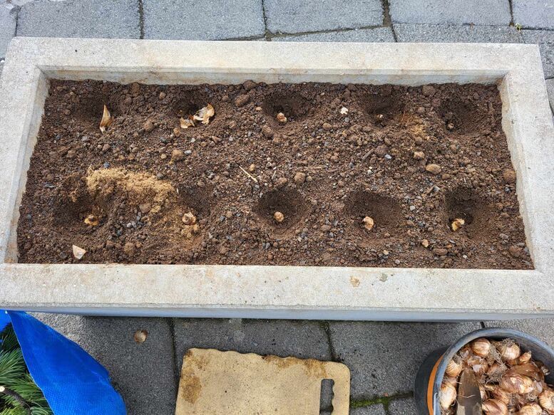 Beitilyng og furugreinar prýða nú blómaker bæjarins. Næsta vor spretta svo upp páskaliljur.