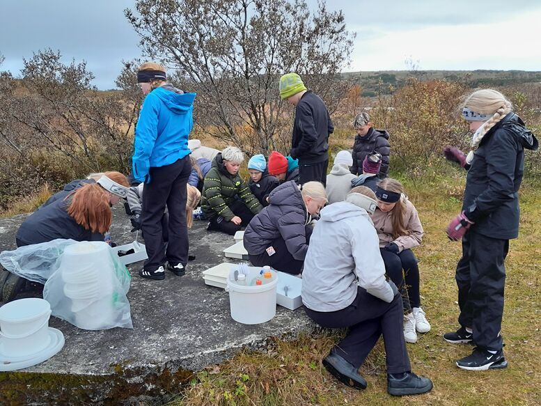 Nemendur úr Hofsstaðaskóla skoða smádýrasýni úr Vífilsstaðalæk