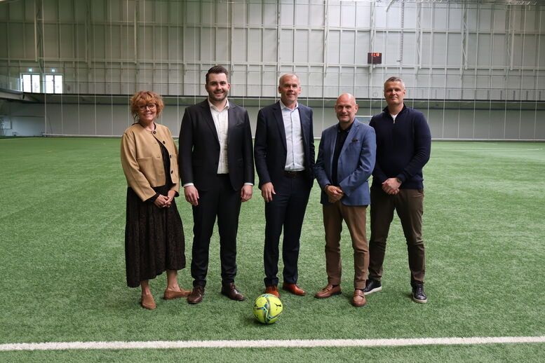 Guðbjörg Linda Udengard sviðsstjóri fræðslu- og frístundasviðs, Hrannar Bragi Eyjólfsson formaður íþrótta- og tómstundaráðs, Almar Guðmundsson bæjarstjóri Garðabæjar, Þorvaldur Örlygsson formaður KSÍ og Eysteinn Pétur Lárusson framkvæmdastjóri KSÍ.