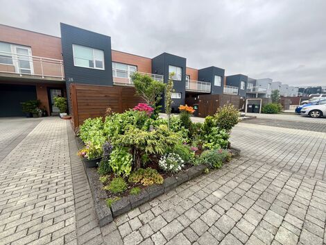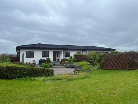 Með eindæmum snyrtileg og blómrík lóð og ber merki þess að vera svolítið framandi. Á pallinum við anddyri eru gróðurkassar fyrir matjurtir og pottar með lyngrósum, fjölærum plöntum og fleiru. Sannkallað augnayndi.