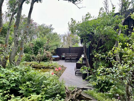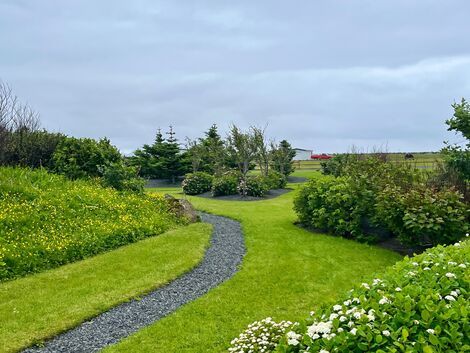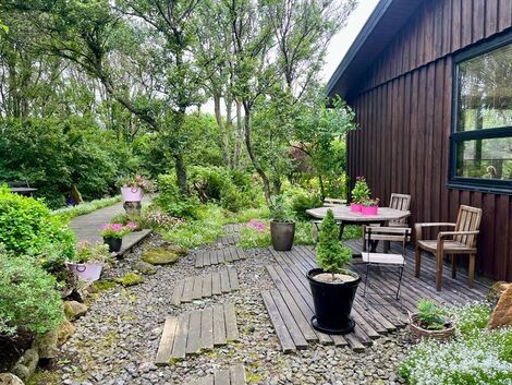 Gróskumikil lóð með mikið af forvitnilegum plöntum. Tjörn er í garðinum, sumarblóm í mörgum kerjum og fjölærar plöntur sem fylgja þegar gengið er á timburpöllum inn í einstaklega blómfagran garð.