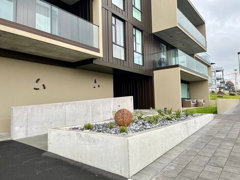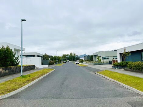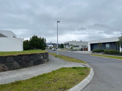 Stéttir og grasflatir tóna vel við glæsilegt hús. Metnaður íbúa er augljós fyrir því að hafa lóð og umhverfi sem snyrtilegast í nýju hverfi í uppbyggingu.